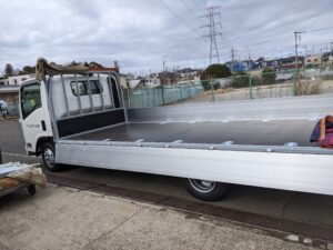 首を長くして待っていた 2tトラックが納車されました! 照明柱を運べるように 荷台は 超ロング仕様です。もちろんオートマ車です。