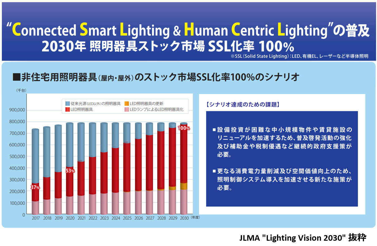 日本照明工業会(JLMA)の照明成長戦略 "Lighting Vision 2030"の目標として、2030年における照明器具ストック市場のSSL(LED、有機EL、レーザー等の半導体照明)化率 100% が掲げられています。この達成により2006年の消費電力に対して、50%削減出来るというシナリオです。